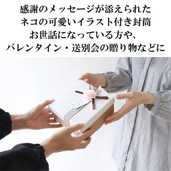 ネコが、おみそ汁を注ぐイラスト封筒に「ありがとうの気持ちを込めて」メッセージ付き
