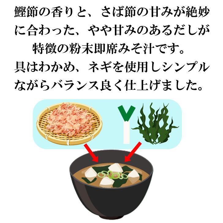 ■原 材 料 粉末味噌(国内製造)、食塩、ぶどう糖、香辛料、わかめ、ねぎ、砂糖、かつお節末、さば節末、かつお節エキス、こんぶエキス、植物油/調味料(アミノ酸等)、カラメル色素、酸味料、(一部に大豆・さばを含む)