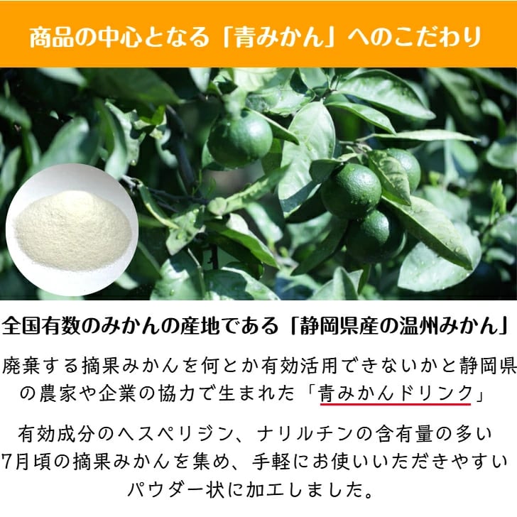 静岡県産の青みかん(未熟温州みかん)を使用した機能性表示食品のドリンクパウダーです。